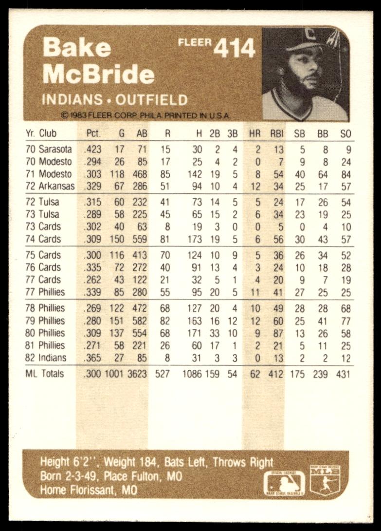 This Baseball card, from 1983 is part of the Fleer  card set. Bake McBride is featured and has a card number of 414.