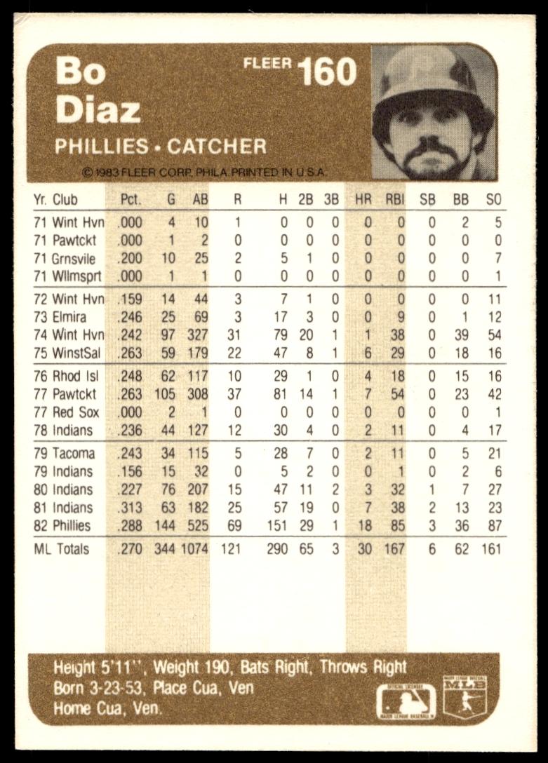 This Baseball card, from 1983 is part of the Fleer  card set. Bo Diaz is featured and has a card number of 160.