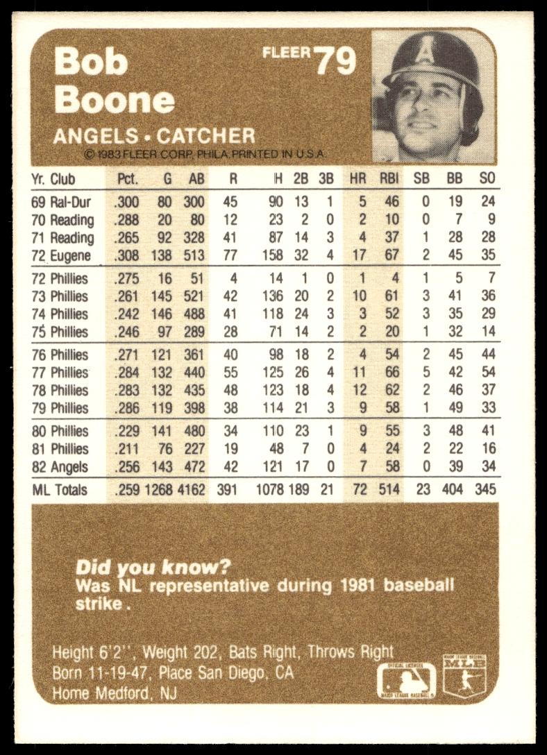 This Baseball card, from 1983 is part of the Fleer  card set. Bob Boone is featured and has a card number of 79.