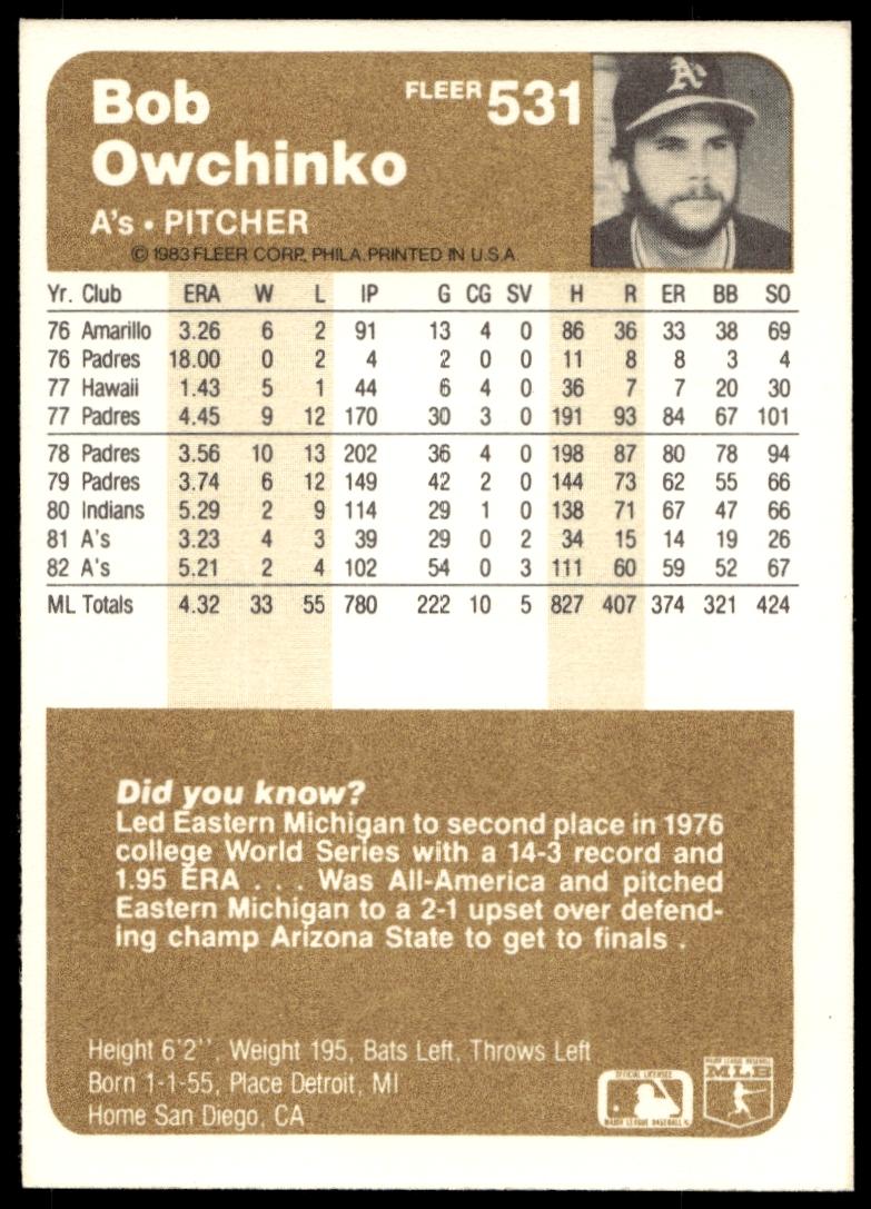 This Baseball card, from 1983 is part of the Fleer  card set. Bob Owchinko is featured and has a card number of 531.