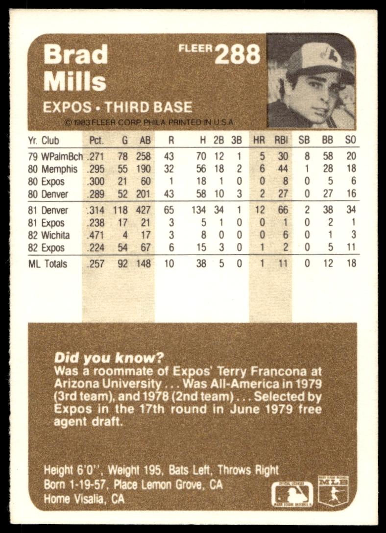 This Baseball card, from 1983 is part of the Fleer  card set. Brad Mills is featured and has a card number of 288.