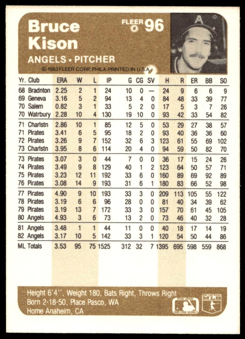 This Baseball card, from 1983 is part of the Fleer  card set. Bruce Kison is featured and has a card number of 96.