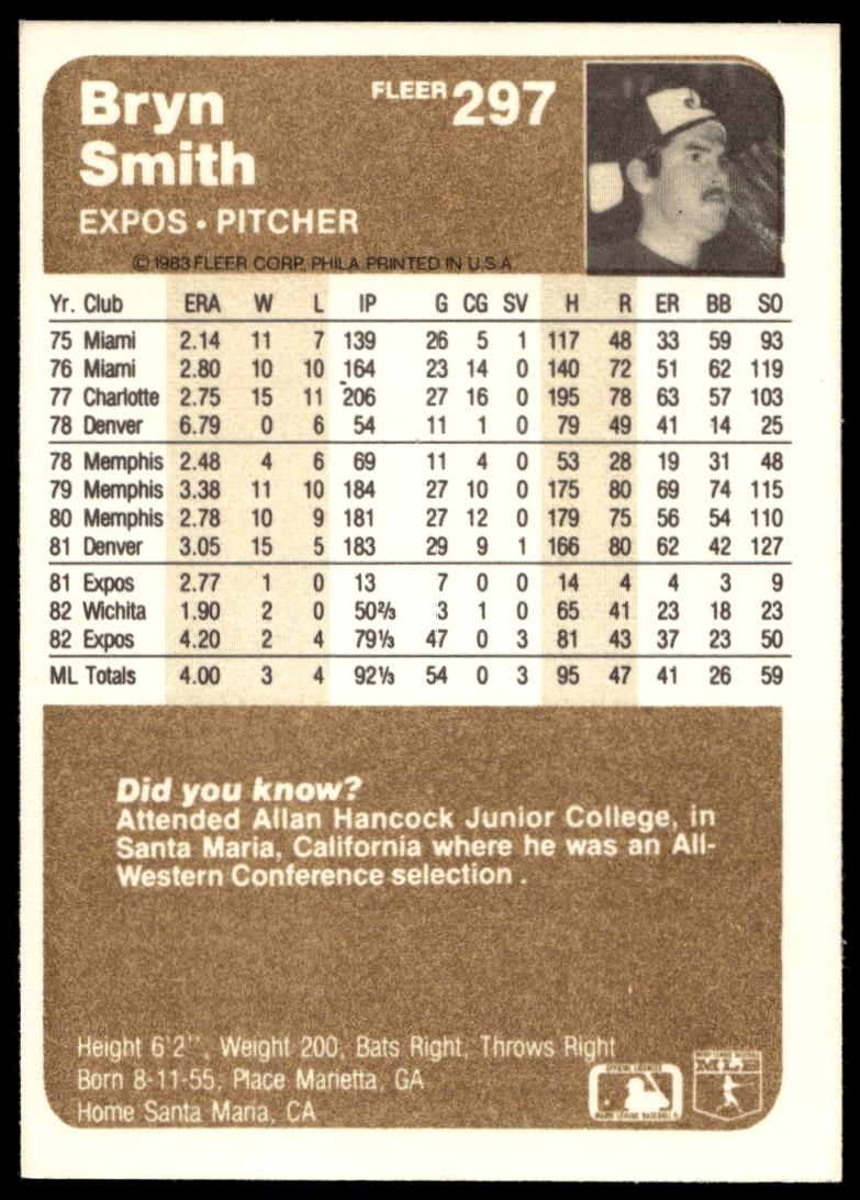 This Baseball card, from 1983 is part of the Fleer  card set. Bryn Smith is featured and has a card number of 297.
