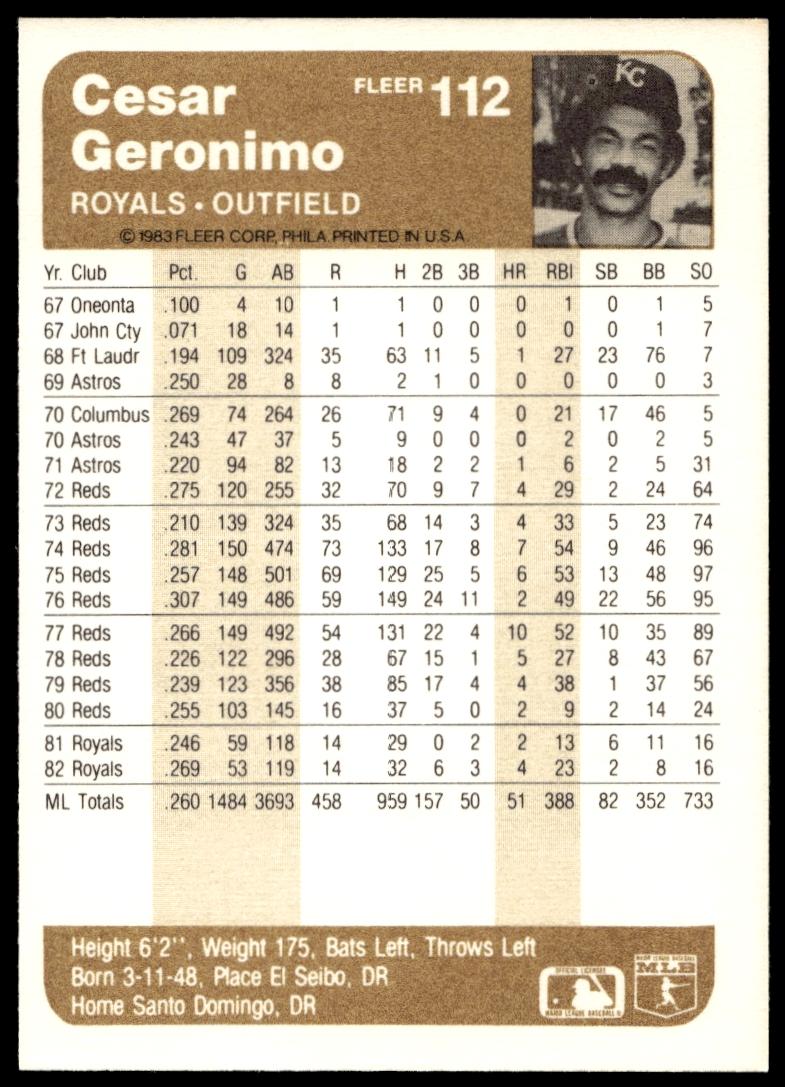 This Baseball card, from 1983 is part of the Fleer  card set. Cesar Geronimo is featured and has a card number of 112.