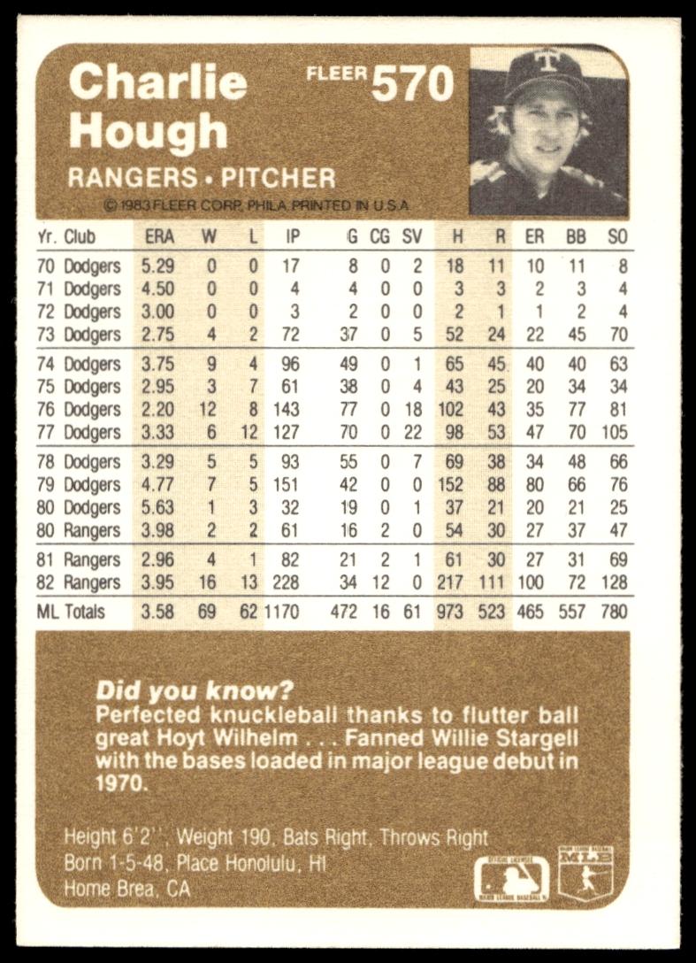 This Baseball card, from 1983 is part of the Fleer  card set. Charlie Hough is featured and has a card number of 570.