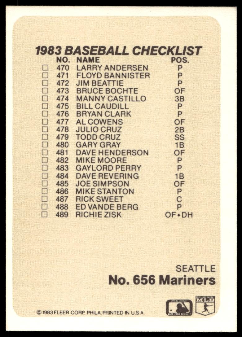 This Baseball card, from 1983 is part of the Fleer  card set. Checklist: Astros / Mariners is featured and has a card number of 656.