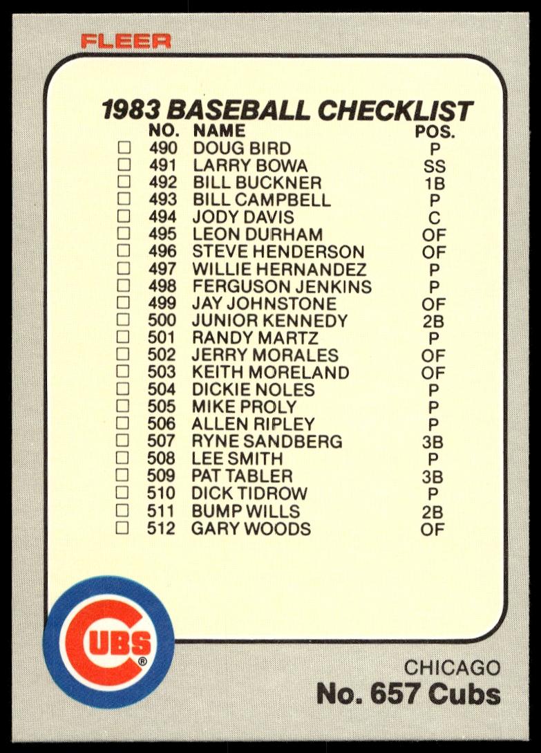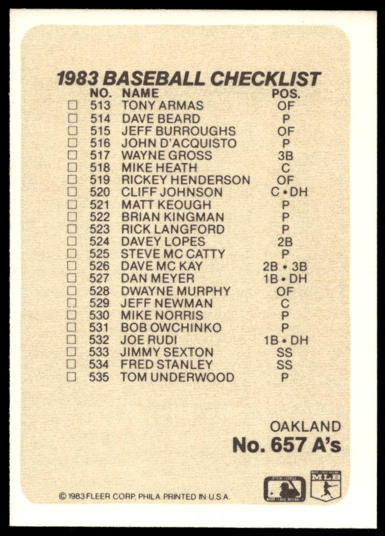This Baseball card, from 1983 is part of the Fleer  card set. Checklist: Cubs / A’s is featured and has a card number of 657.