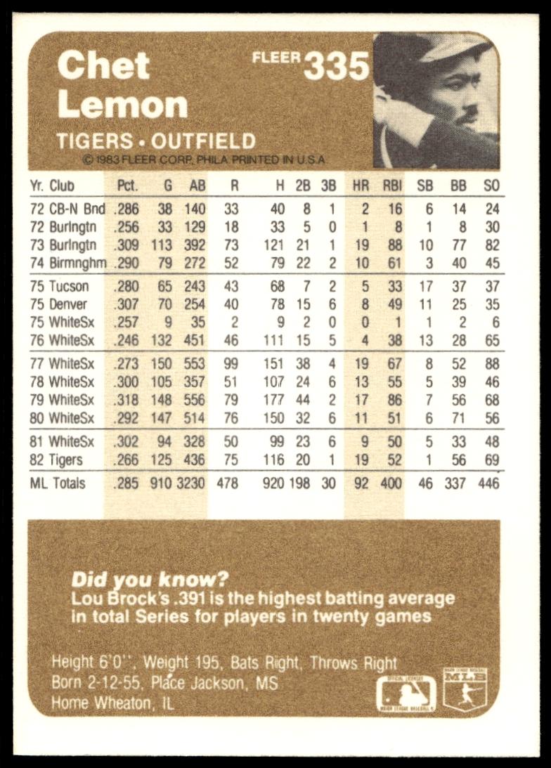 This Baseball card, from 1983 is part of the Fleer  card set. Chet Lemon is featured and has a card number of 335.