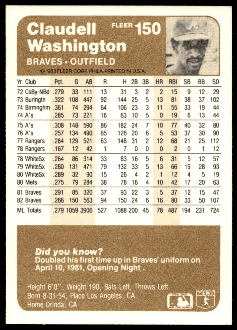 This Baseball card, from 1983 is part of the Fleer  card set. Claudell Washington is featured and has a card number of 150.