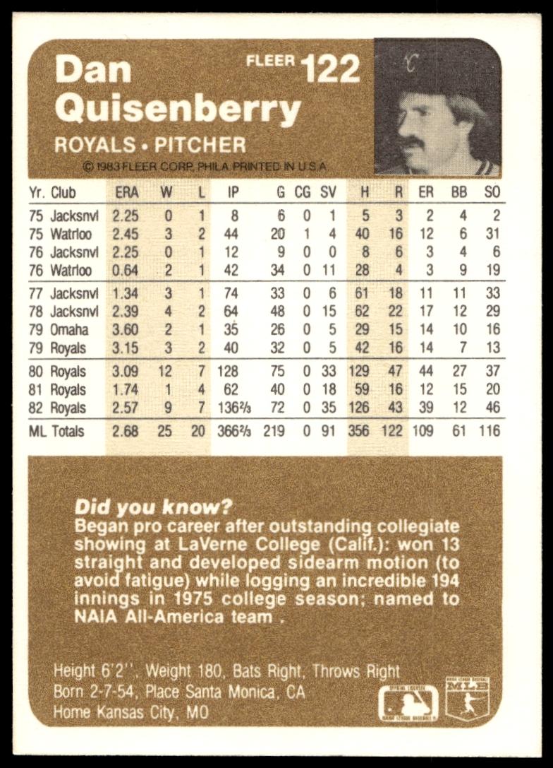 This Baseball card, from 1983 is part of the Fleer  card set. Dan Quisenberry is featured and has a card number of 122.