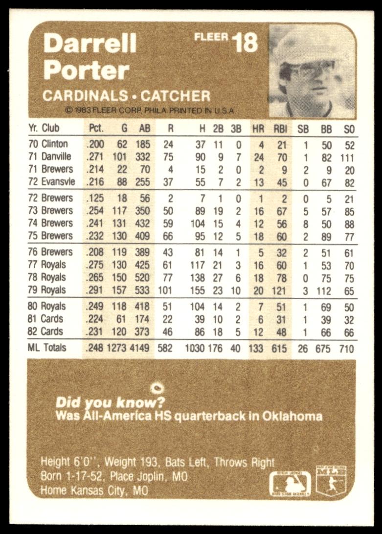 This Baseball card, from 1983 is part of the Fleer  card set. Darrell Porter is featured and has a card number of 18.