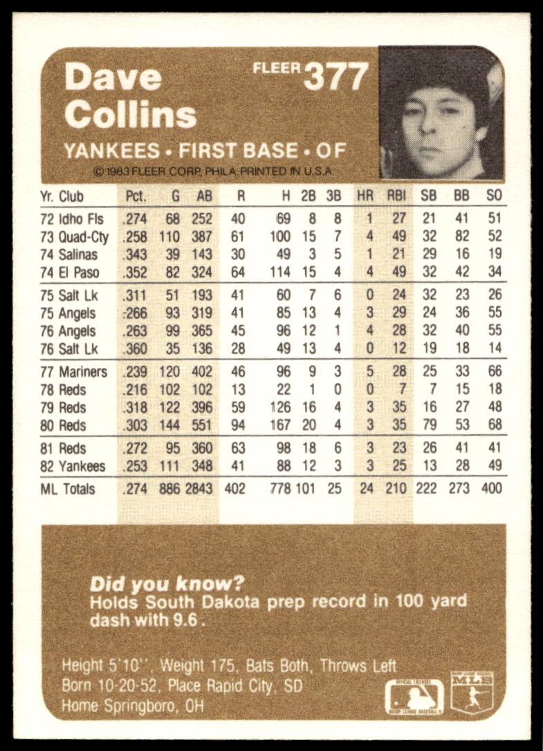 This Baseball card, from 1983 is part of the Fleer  card set. Dave Collins is featured and has a card number of 377.