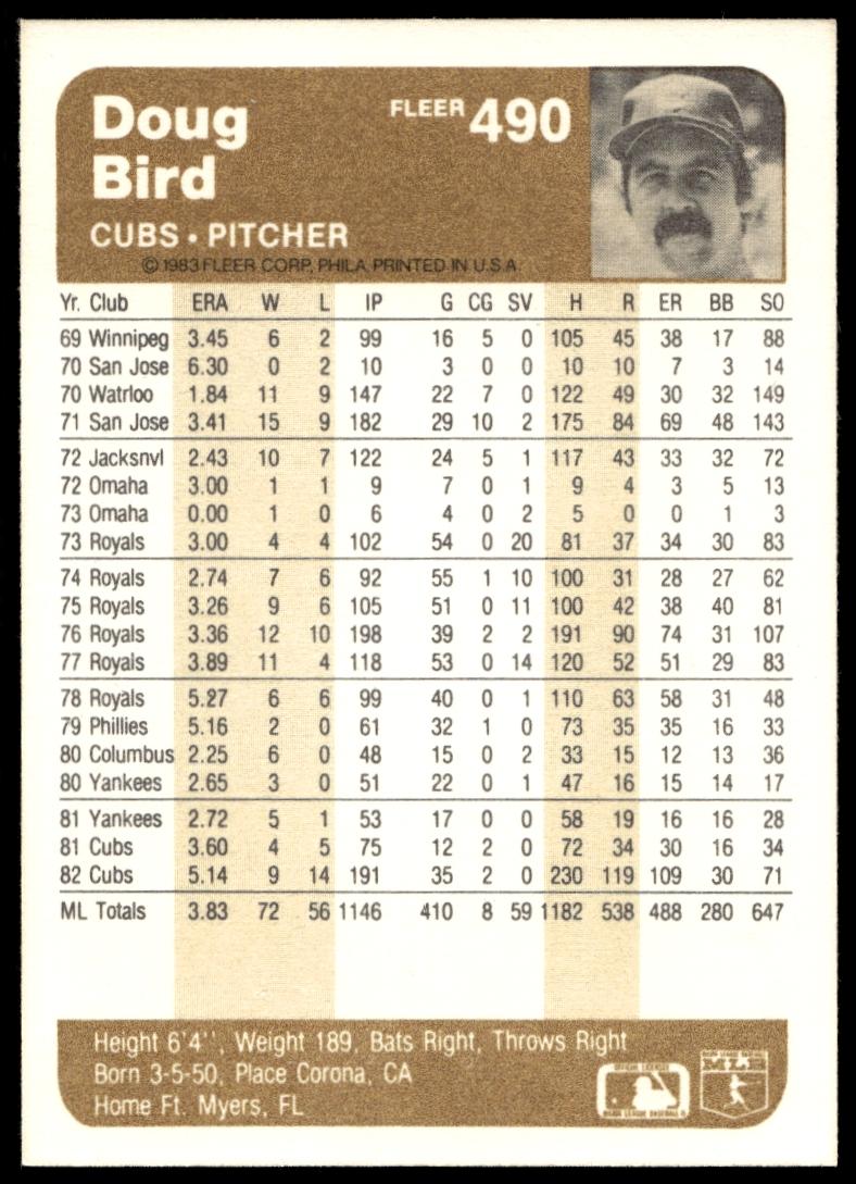 This Baseball card, from 1983 is part of the Fleer  card set. Doug Bird is featured and has a card number of 490.
