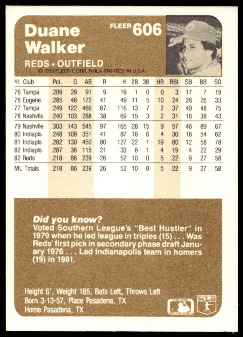 This Baseball card, from 1983 is part of the Fleer  card set. Duane Walker is featured and has a card number of 606.