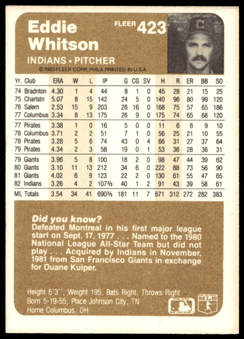 This Baseball card, from 1983 is part of the Fleer  card set. Eddie Whitson is featured and has a card number of 423.
