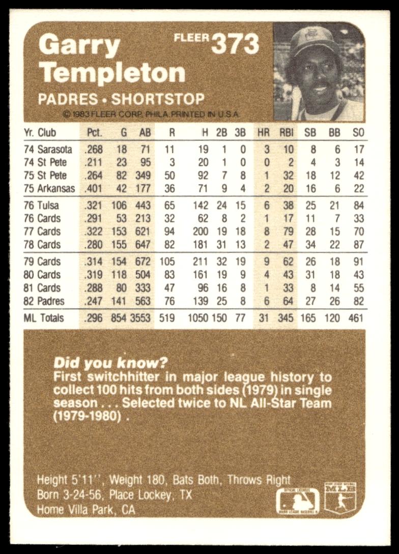 This Baseball card, from 1983 is part of the Fleer  card set. Garry Templeton is featured and has a card number of 373.