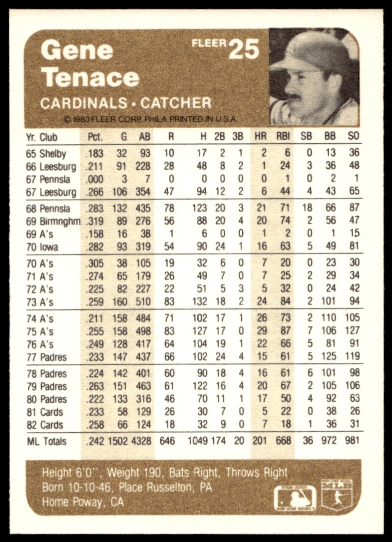 This Baseball card, from 1983 is part of the Fleer  card set. Gene Tenace is featured and has a card number of 25.