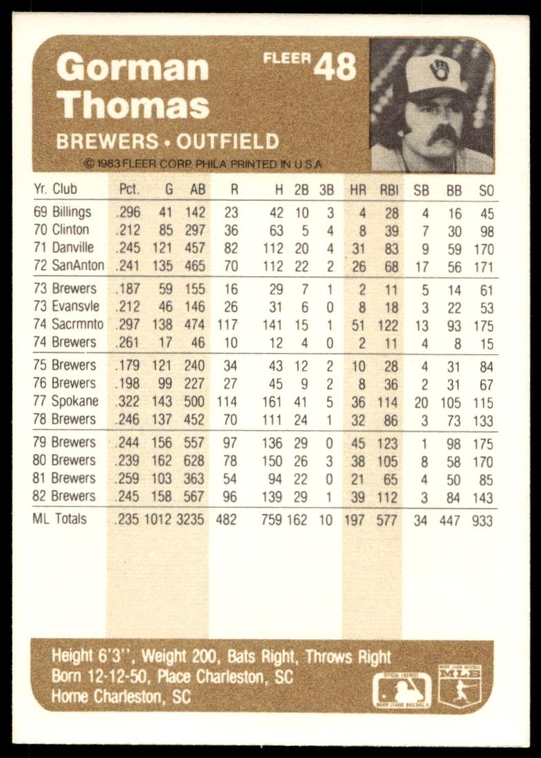 This Baseball card, from 1983 is part of the Fleer  card set. Gorman Thomas is featured and has a card number of 48.
