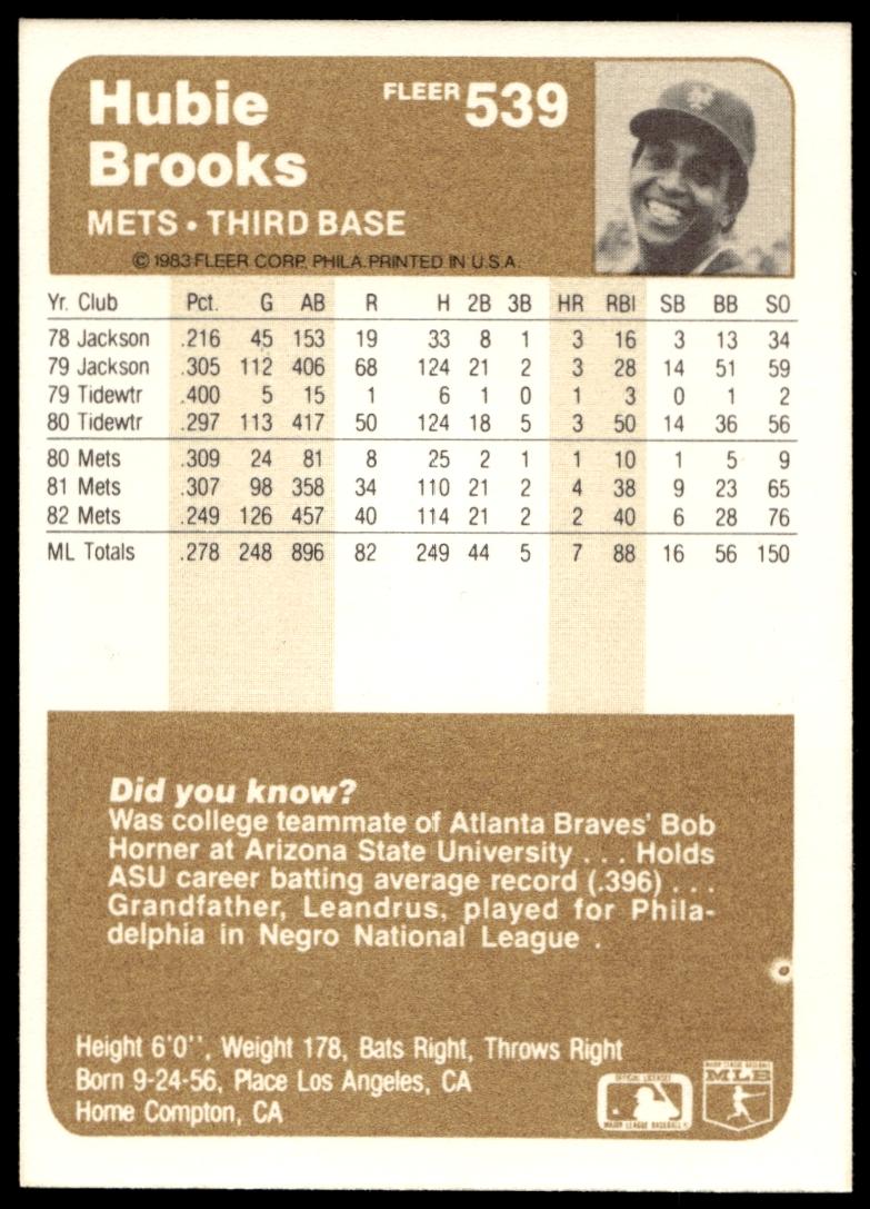 This Baseball card, from 1983 is part of the Fleer  card set. Hubie Brooks is featured and has a card number of 539.