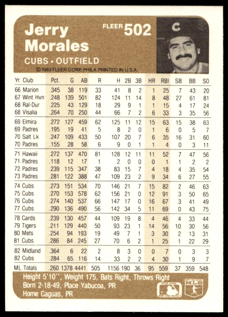 This Baseball card, from 1983 is part of the Fleer  card set. Jerry Morales is featured and has a card number of 502.