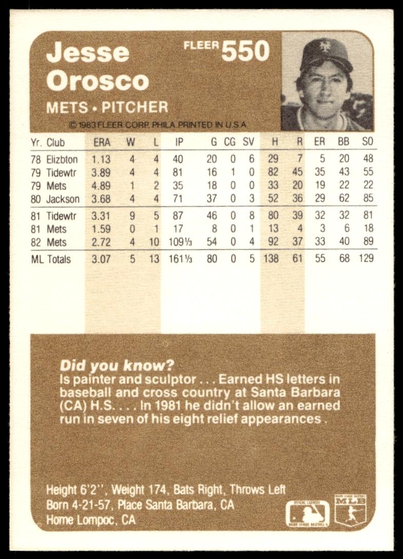 This Baseball card, from 1983 is part of the Fleer  card set. Jesse Orosco is featured and has a card number of 550.