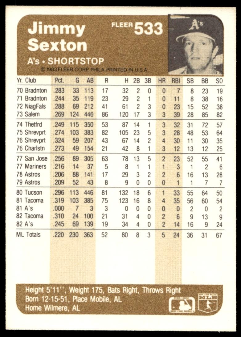 This Baseball card, from 1983 is part of the Fleer  card set. Jimmy Sexton is featured and has a card number of 533.