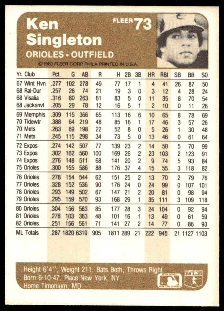 This Baseball card, from 1983 is part of the Fleer  card set. Ken Singleton is featured and has a card number of 73.