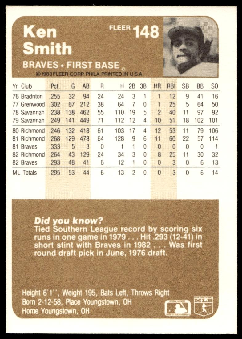 This Baseball card, from 1983 is part of the Fleer  card set. Ken Smith is featured and has a card number of 148.