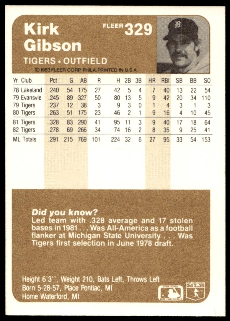 This Baseball card, from 1983 is part of the Fleer  card set. Kirk Gibson is featured and has a card number of 329.