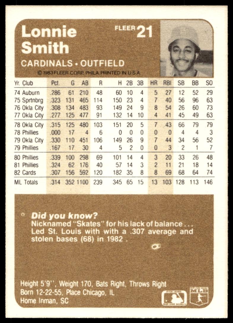 This Baseball card, from 1983 is part of the Fleer  card set. Lonnie Smith is featured and has a card number of 21.