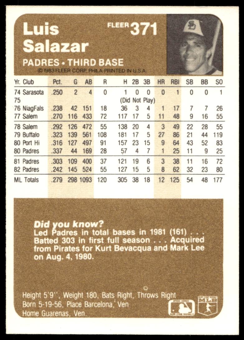 This Baseball card, from 1983 is part of the Fleer  card set. Luis Salazar is featured and has a card number of 371.