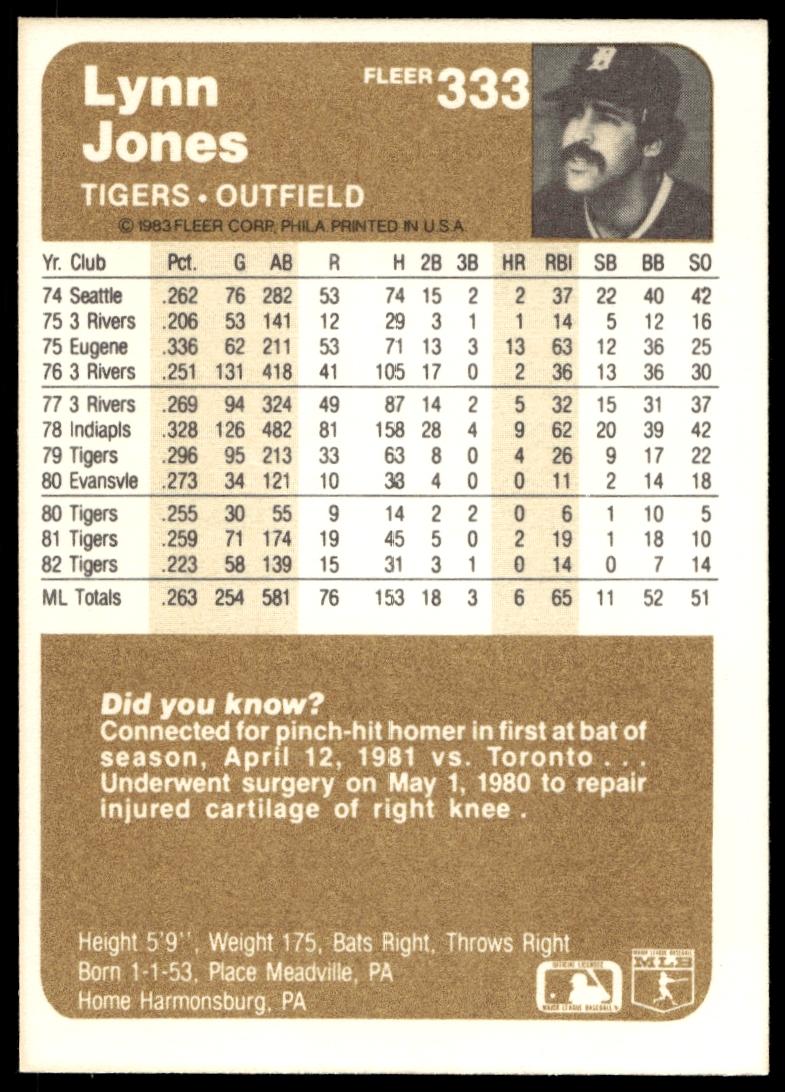 This Baseball card, from 1983 is part of the Fleer  card set. Lynn Jones is featured and has a card number of 333.