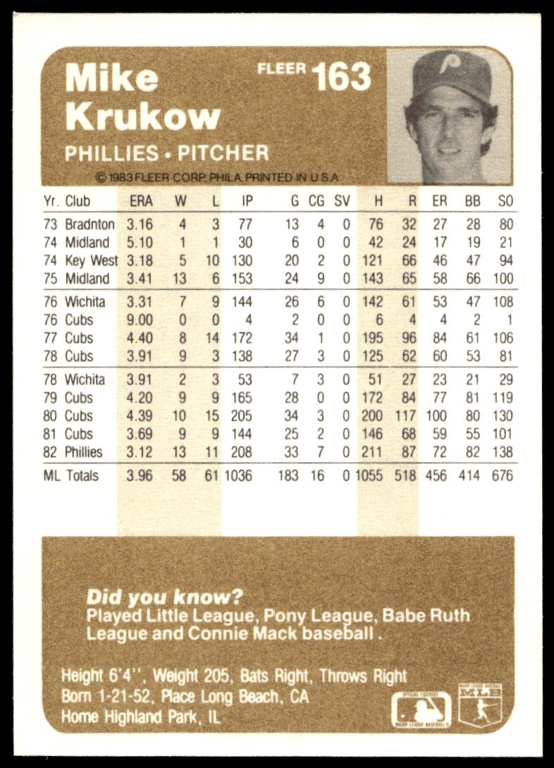 This Baseball card, from 1983 is part of the Fleer  card set. Mike Krukow is featured and has a card number of 163.