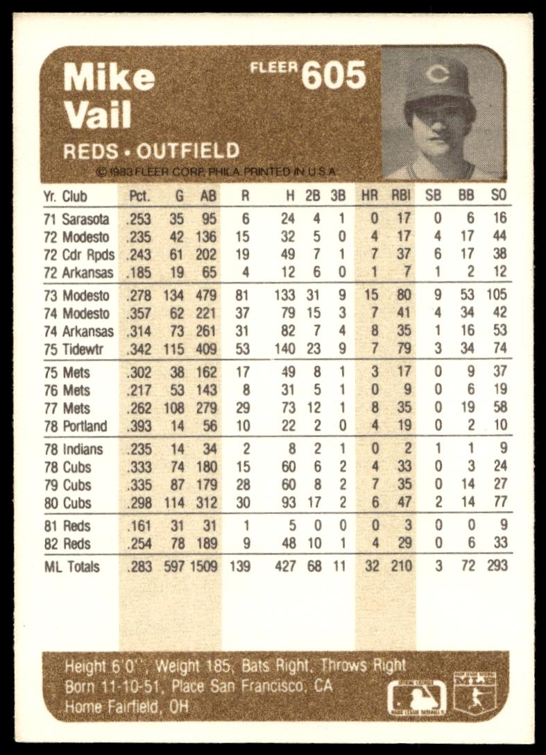 This Baseball card, from 1983 is part of the Fleer  card set. Mike Vail is featured and has a card number of 605.