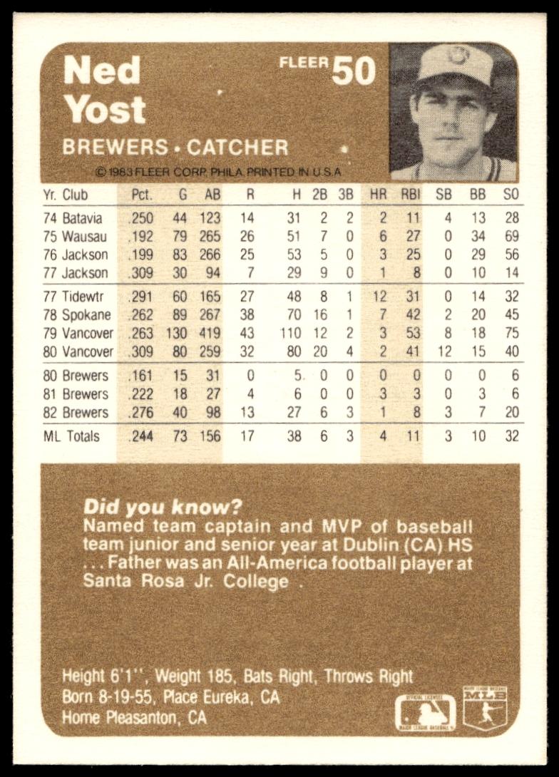 This Baseball card, from 1983 is part of the Fleer  card set. Ned Yost is featured and has a card number of 50.