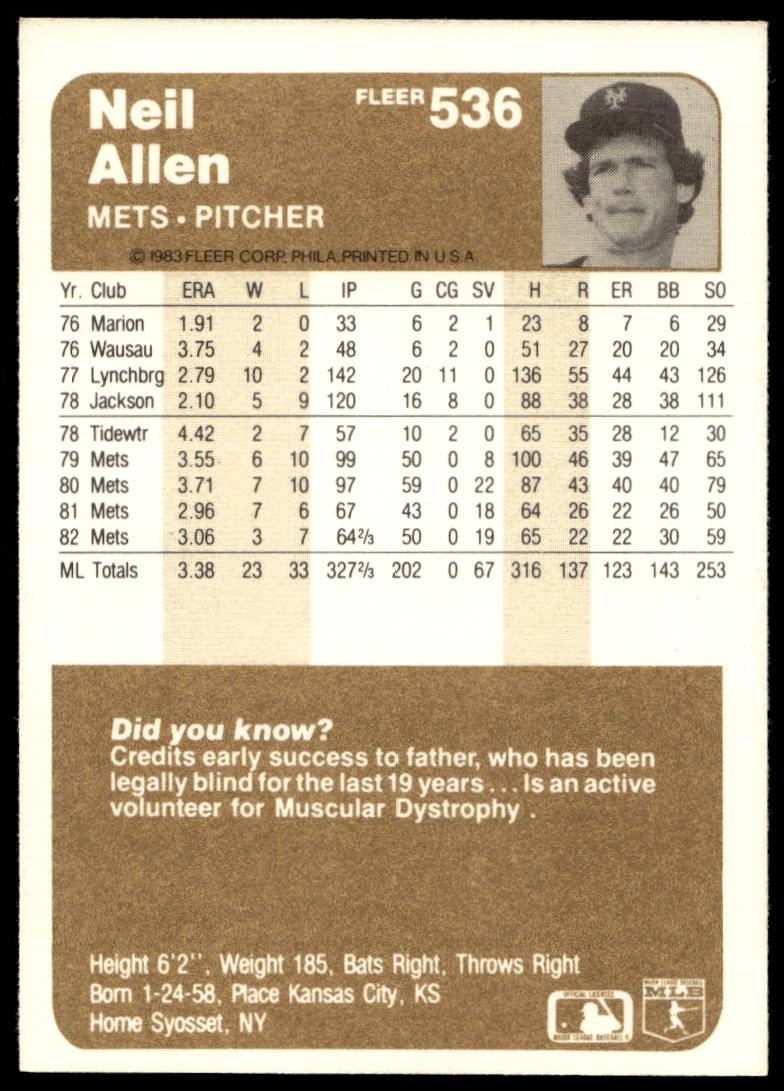 This Baseball card, from 1983 is part of the Fleer  card set. Neil Allen is featured and has a card number of 536.