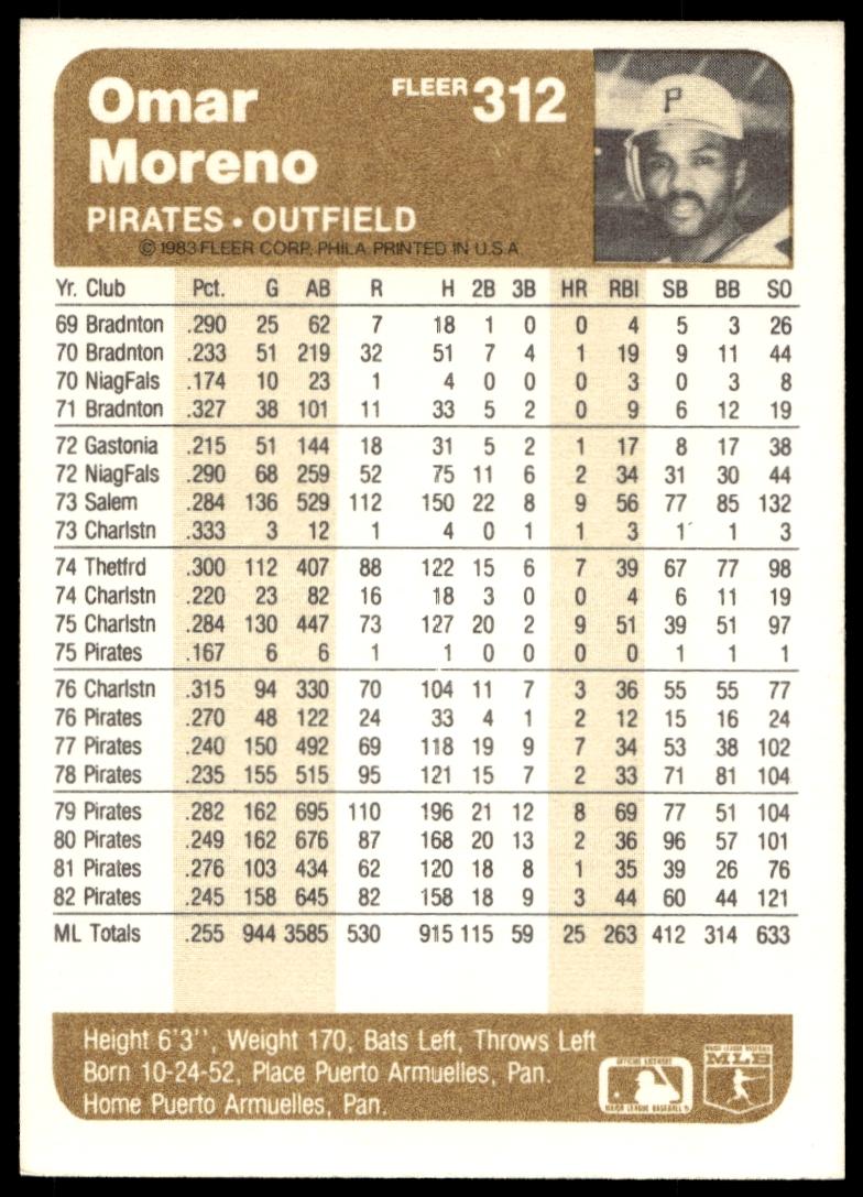 This Baseball card, from 1983 is part of the Fleer  card set. Omar Moreno is featured and has a card number of 312.