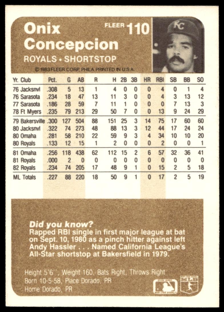This Baseball card, from 1983 is part of the Fleer  card set. Onix Concepcion is featured and has a card number of 110.