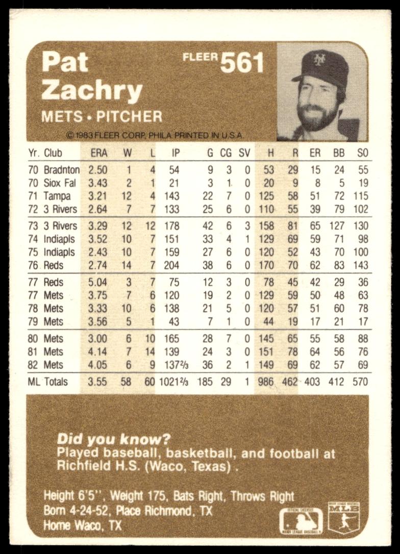 This Baseball card, from 1983 is part of the Fleer  card set. Pat Zachry is featured and has a card number of 561.