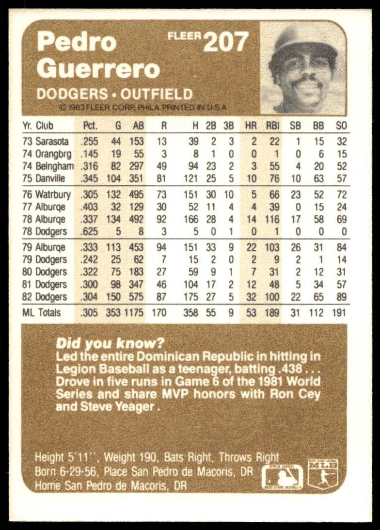 This Baseball card, from 1983 is part of the Fleer  card set. Pedro Guerrero is featured and has a card number of 207.