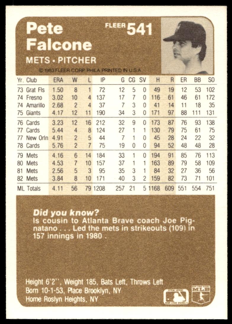This Baseball card, from 1983 is part of the Fleer  card set. Pete Falcone is featured and has a card number of 541.