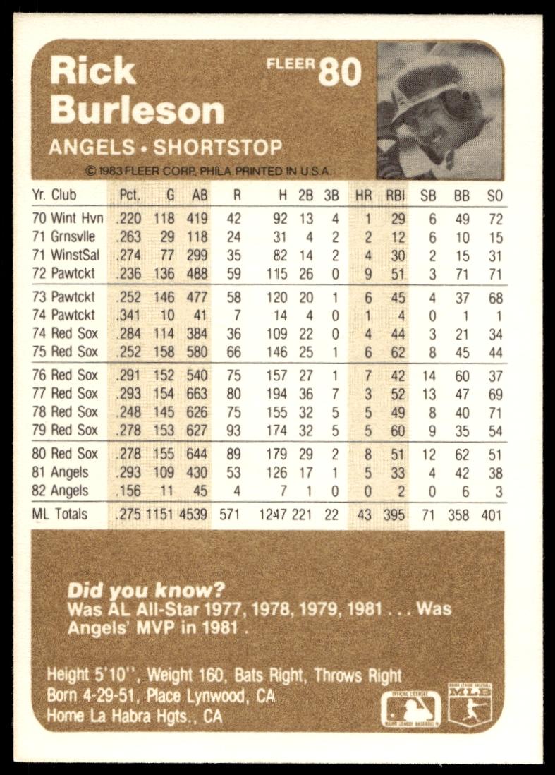 This Baseball card, from 1983 is part of the Fleer  card set. Rick Burleson is featured and has a card number of 80.
