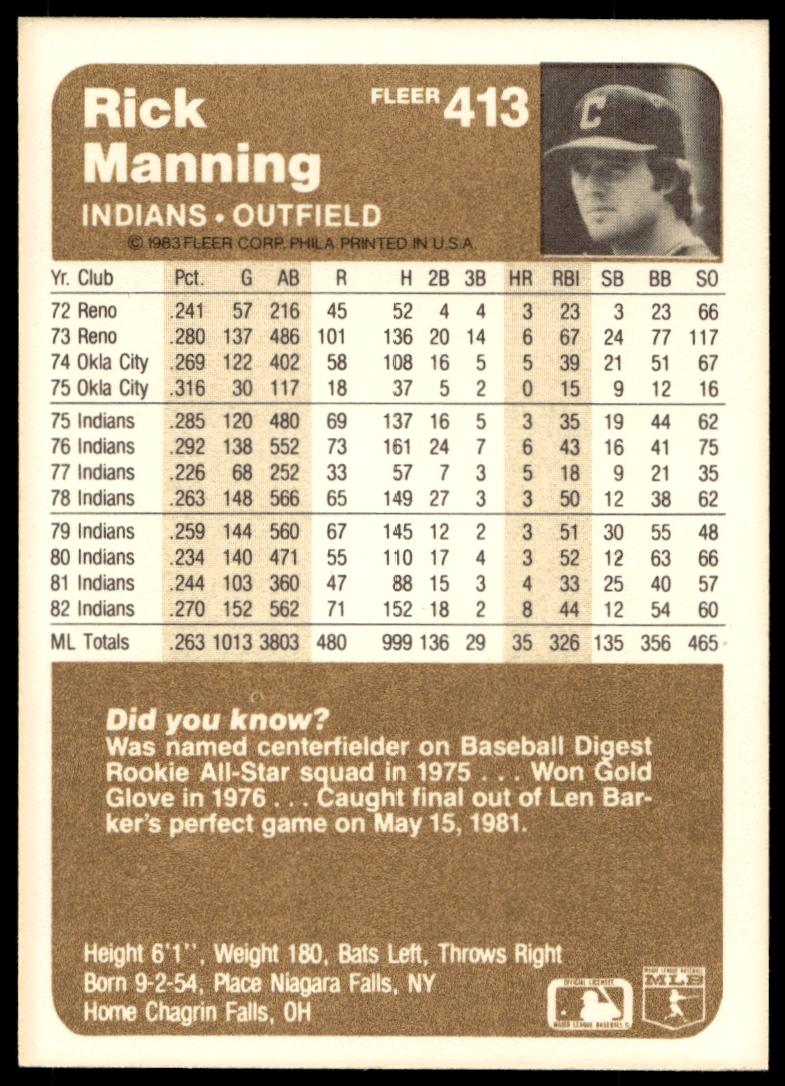 This Baseball card, from 1983 is part of the Fleer  card set. Rick Manning is featured and has a card number of 413.