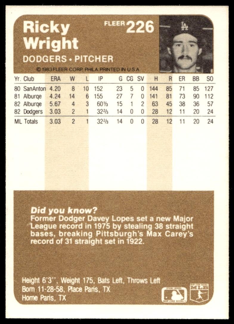 This Baseball card, from 1983 is part of the Fleer  card set. Ricky Wright is featured and has a card number of 226.