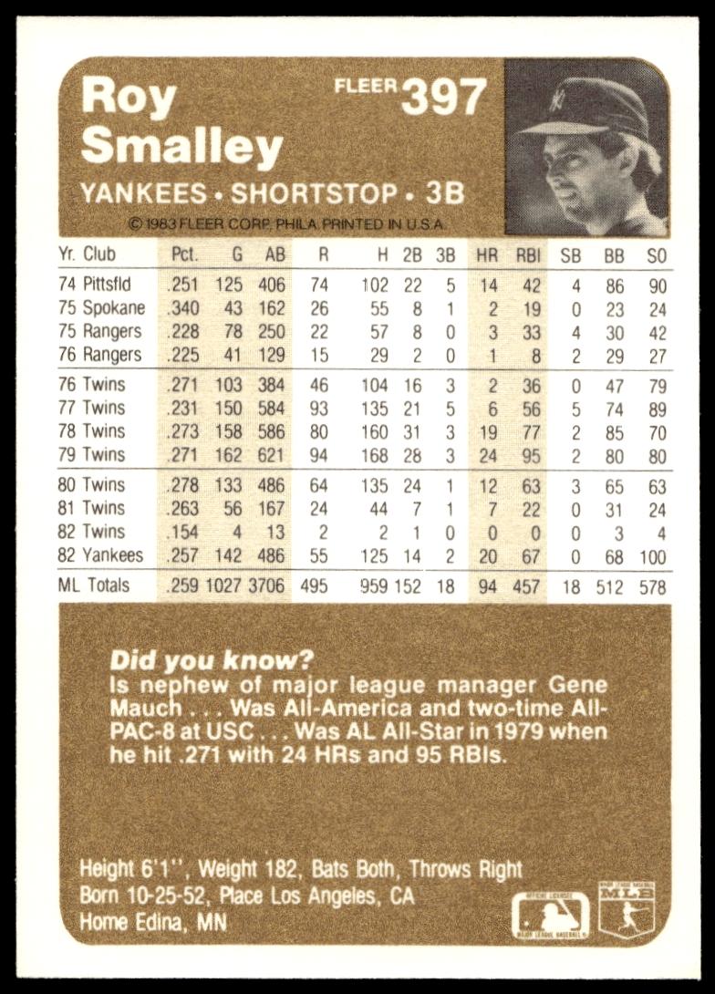 This Baseball card, from 1983 is part of the Fleer  card set. Roy Smalley is featured and has a card number of 397.