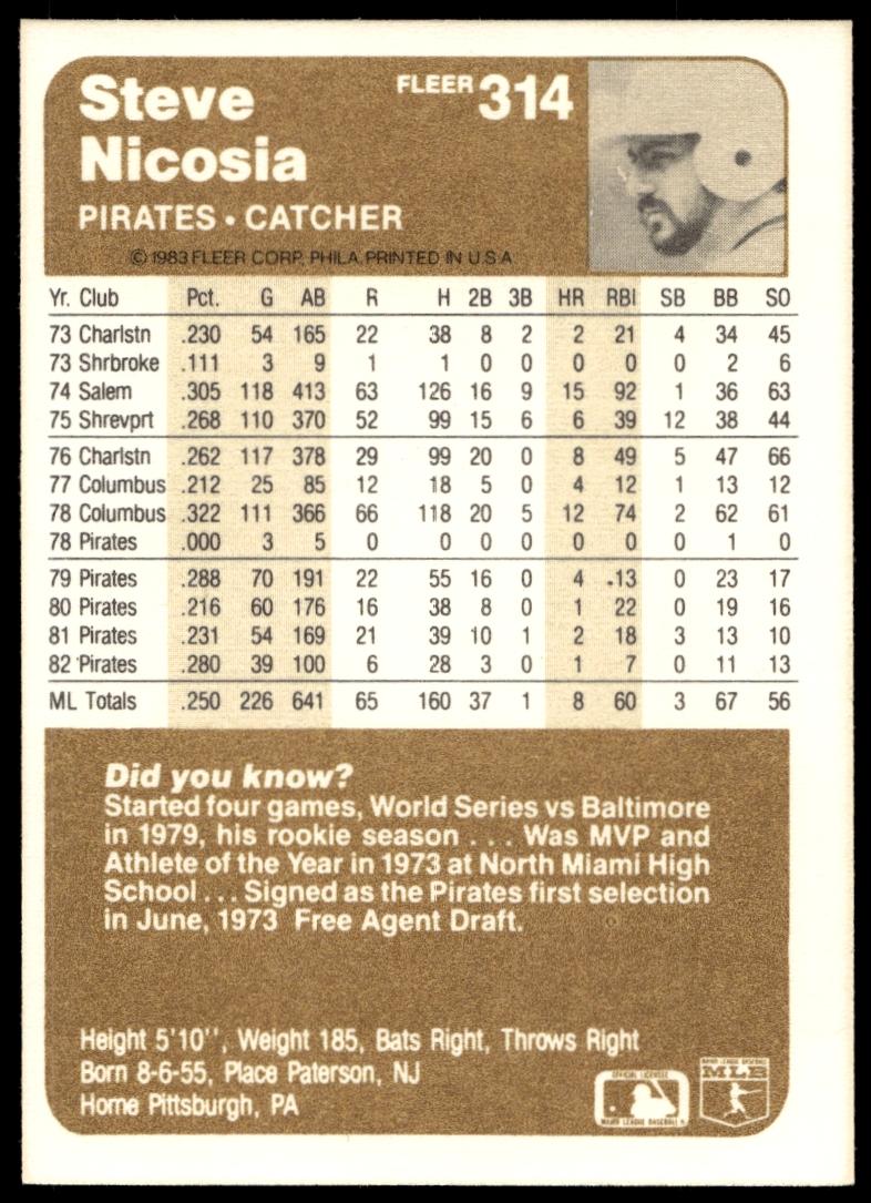 This Baseball card, from 1983 is part of the Fleer  card set. Steve Nicosia is featured and has a card number of 314.