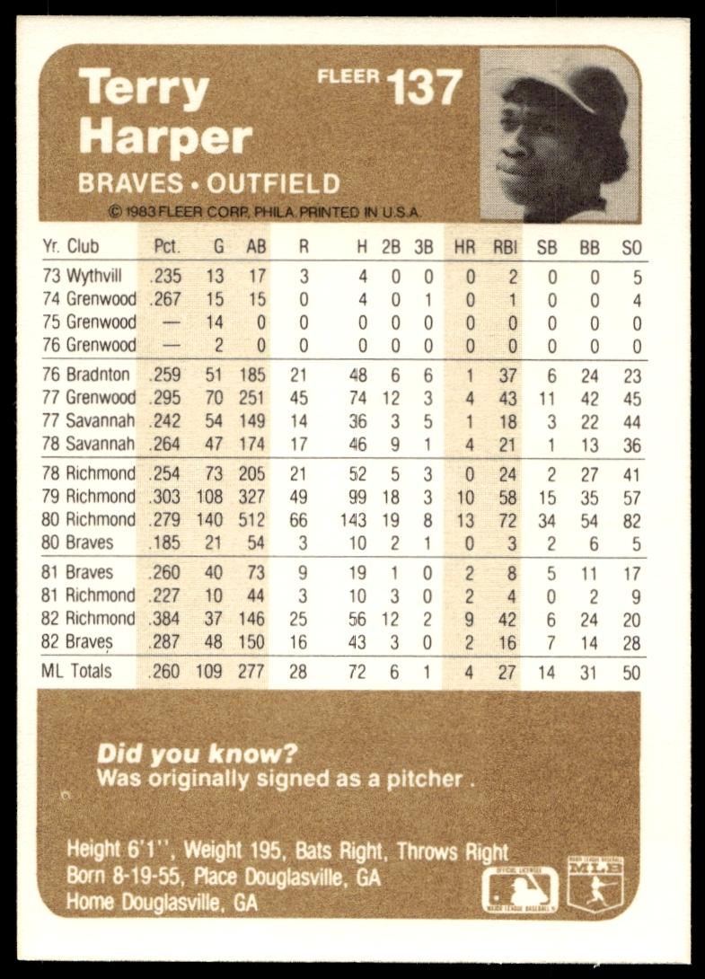 This Baseball card, from 1983 is part of the Fleer  card set. Terry Harper is featured and has a card number of 137.