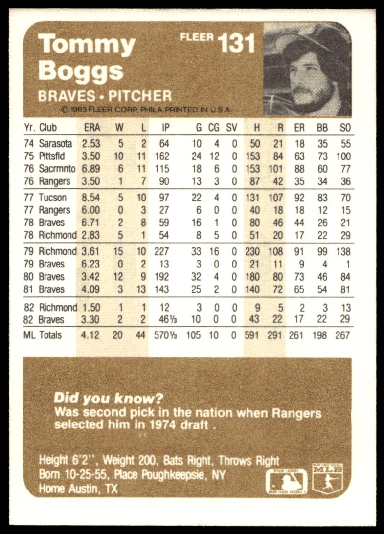 This Baseball card, from 1983 is part of the Fleer  card set. Tommy Boggs is featured and has a card number of 131.