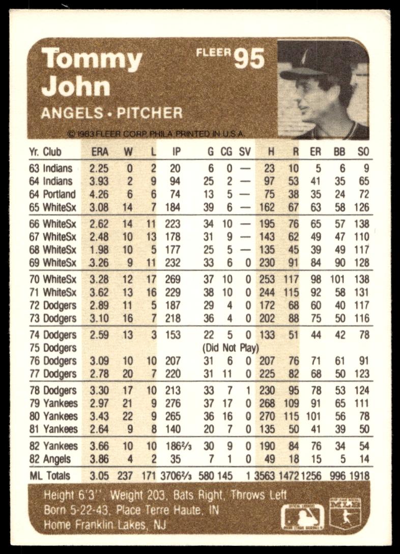 This Baseball card, from 1983 is part of the Fleer  card set. Tommy John is featured and has a card number of 95.