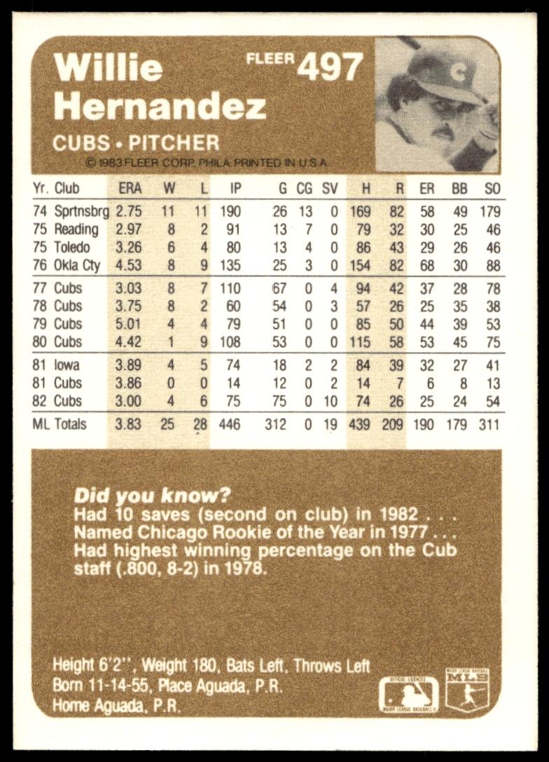 This Baseball card, from 1983 is part of the Fleer  card set. Willie Hernandez is featured and has a card number of 497.